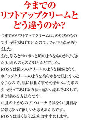 目のまわりのシワ、たるみ、気になりますよね。「ともかく目のまわりだけどうにかなれば…」と、思っているかもしれませんが、たるみは、上からやってきます。目の回りだけにハリが出ても、思ったほどの効果はえられないかも…お肌のたるみケアにリフトアップクリームROSYを。